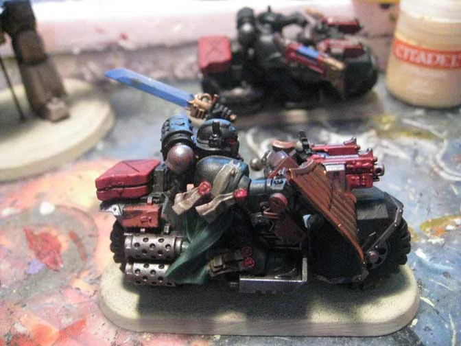Also in this batch are some Raven Wing bikers, these are the three that came in the Dark Vengeance set. The sculpts on these are a bit weird as I'm not sure why a marine would have a scroll on the outside of his calf like a bad tatoo other than the digital sculptor just thought they need something there. (I imagine an art director screaming more flair, 15 is not enough). My client wasn't a fan of the wings on the back and clipped them off to add some gas cans (long range patrols need extra fuel, right?)