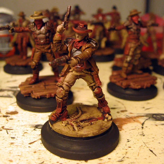 /Wild West Exodus – After getting these models assembled and primed with red oxide primer, I began blocking in the basic colors. It's a little weird at the moment because it was requested that I keep the models primarily brown and tan. There's no limit to the number of browns and tans I can paint but its hard to tell what's going on with the models at this stage.