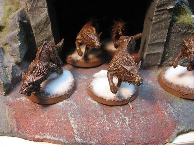 The pack of wolves for this job turned out pretty good, a pretty basic color scheme with some snow basing to match the rest of the force.