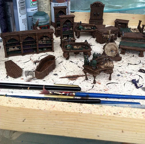 The bulk of this project consists of scatter terrain like tables, book shelves, small portals, torture implements, an archery range and throne. To get started I put down a base coat of brown light dry brush of a tan followed by a wash of agrax earthshade. For the stonework it was a similar process using grays instead of browns.