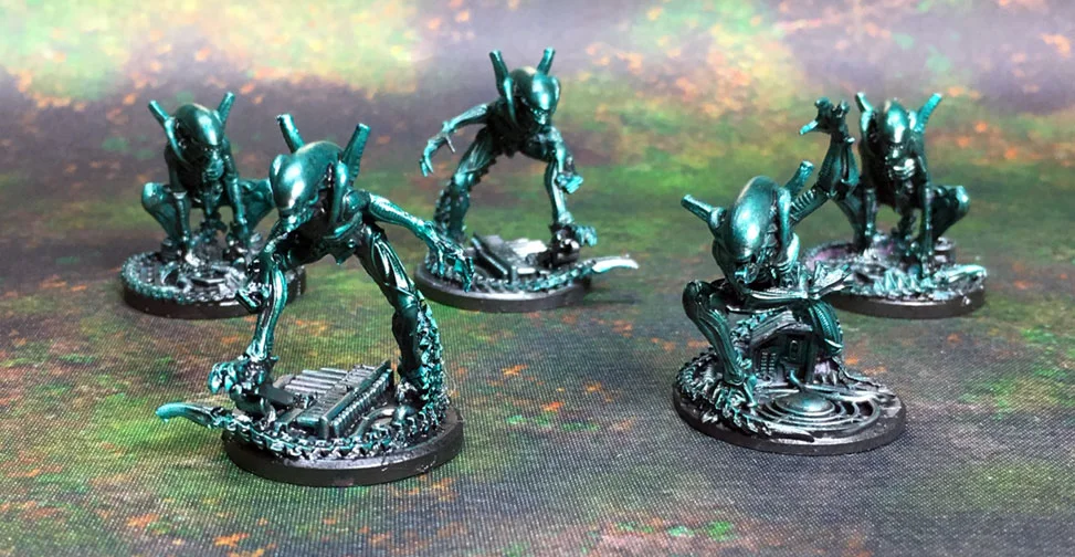 For the Xenomorphs I started with a metallic green base coat. After two coats of black wash it looks just about right. Having a bug-like sheen on them brings out the detail. I have previously experimented with metallic black or just painting them black with highlights and I didn’t like the results. when they’re that dark all the detail disappears and it diminishes the quality of the miniature. Especially when they’re small and thin like these.