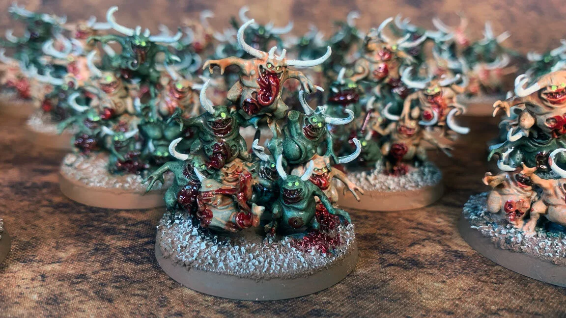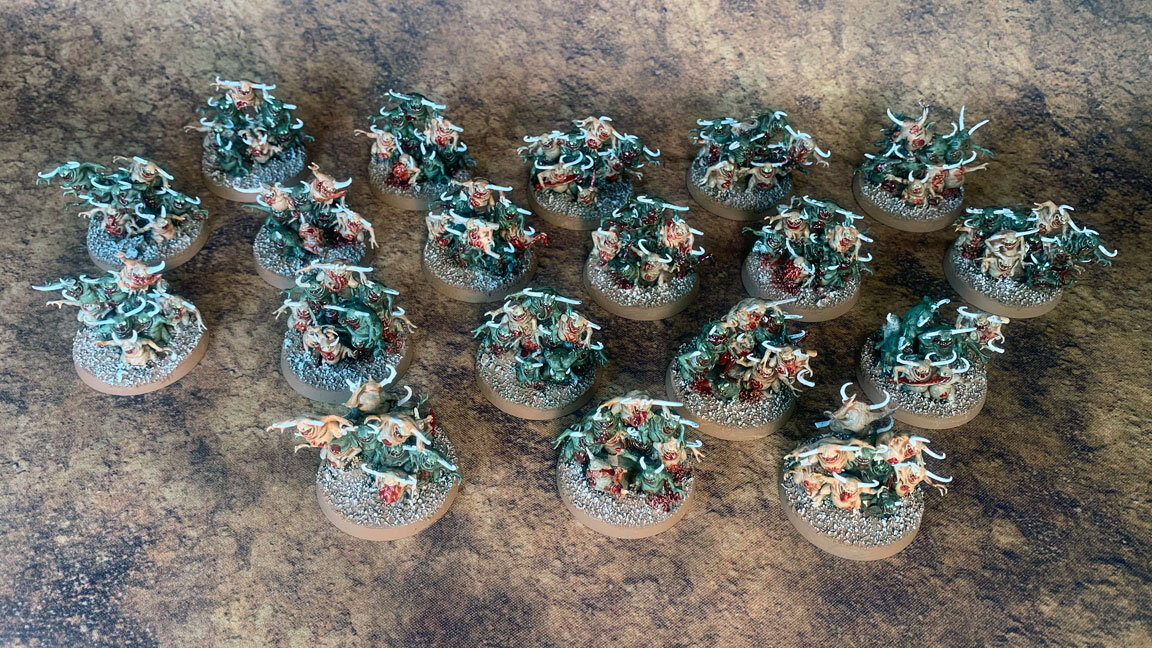 That line of thinking is most likely what brought these little guys to my table. I’ve painted hordes of Nurglings for clients before but I don’t think I’ve ever painted this many. The paint scheme uses a mix of greens and flesh tones washed with camoshade and detailed with gore to make these diseased little monsters tablet-top ready.