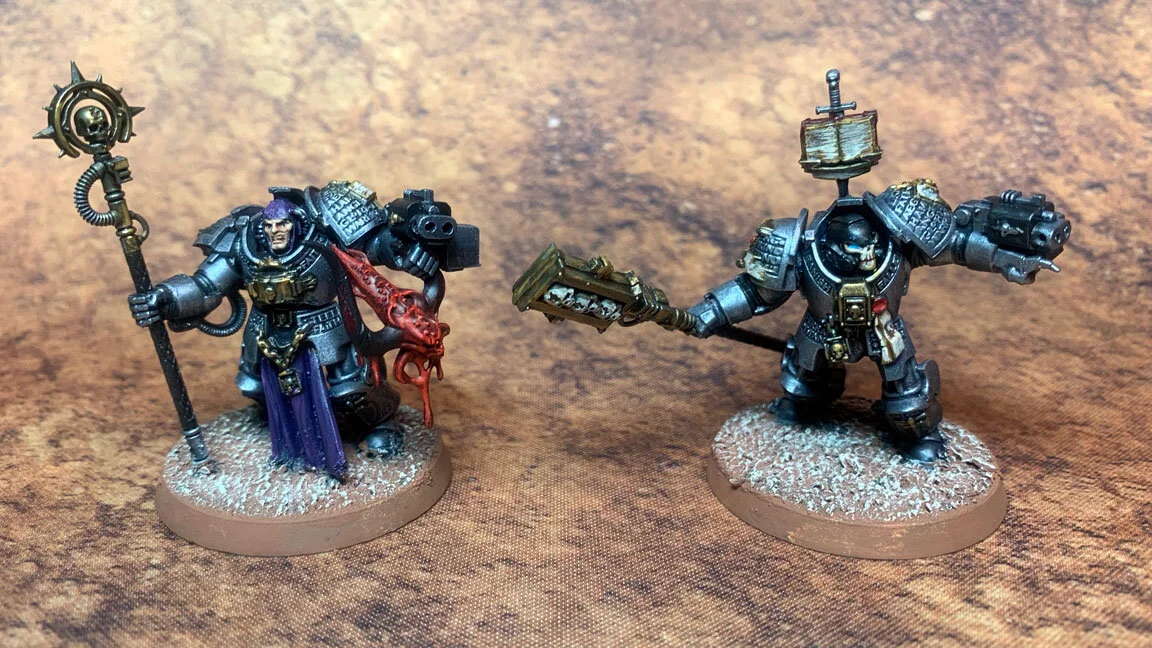 Painting these up was fun. I used a gunmetal base washed with nightshade which I followed with a silver dry brush. This gave me a solid base that I could detail out by using Black Templar Contrast paint on the ribbing and Aggaros Dunes on the gold elements to get a good base. From there I painted the purity seals and applied and old gold highlight. My client likes purple robes on his psykers so thats what I did with these. The end result is really nice and I’m looking forward to painting the rest of the force.